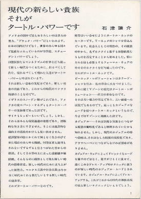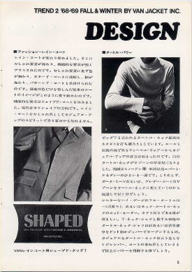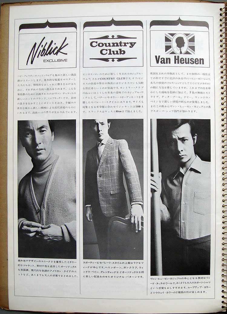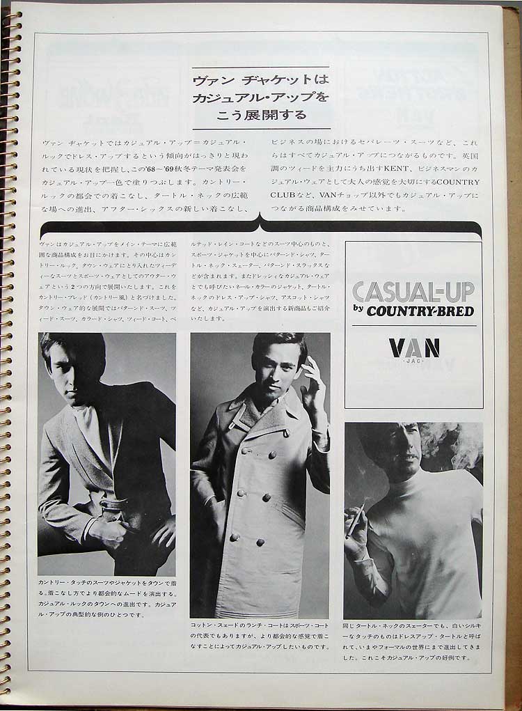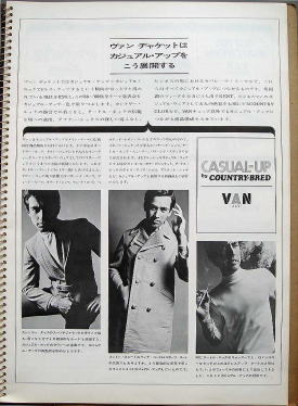 この“CASUAL-UP”のネーミングは、VAN同様ネーミングの得意な会社の一つである潟激iウンが1968年以前に商品ネームとして使っていたものでしたが、石津謙介さんはレナウンに一応の挨拶をして、このネーミングをキャンペーン・テーマとして使用したと聞いています。 』 (コメント及び資料提供 : 能勢 裕氏) |