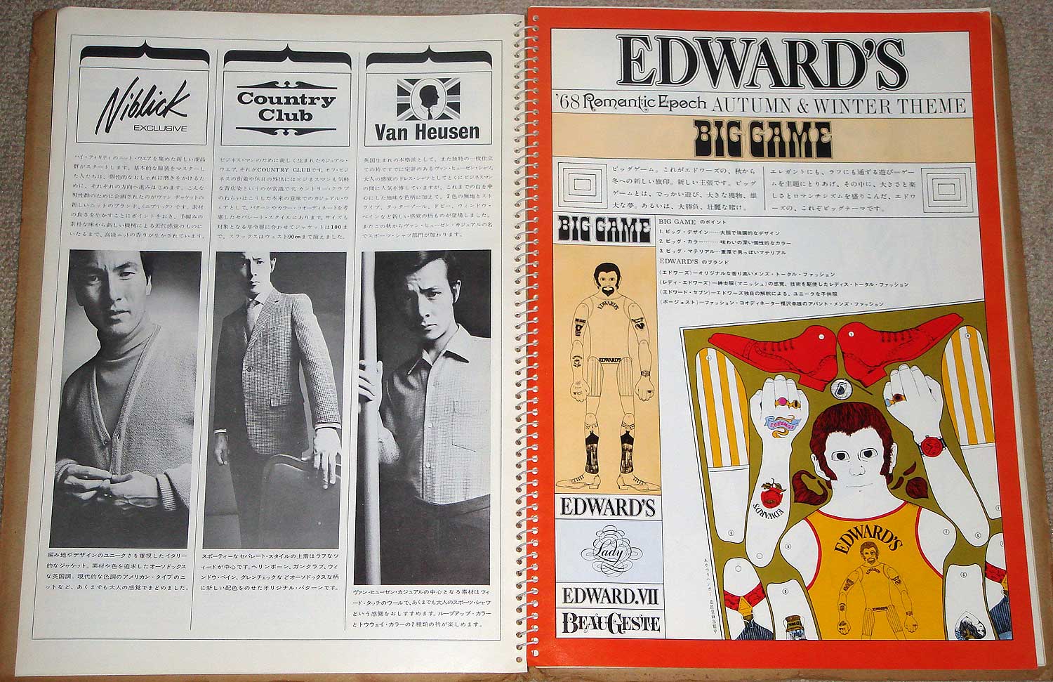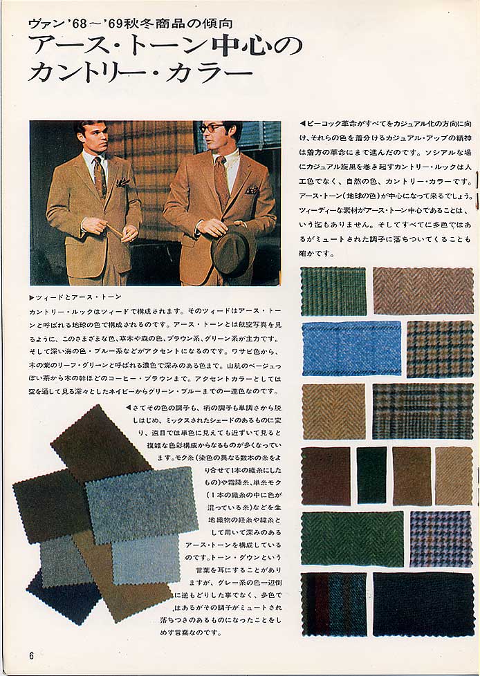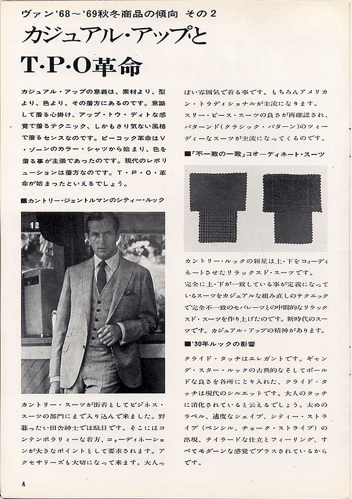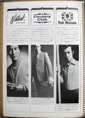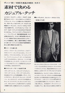 1968年春夏は、時の「 ピーコック革命 」に対応した“ ADVENTURE ”のキャンペーン・テーマを打ち出し、男に色を着せると言う名目の元、着る楽しさと開放感にあふれたカジュアル・ウェアに焦点を当て、時流を上手く捉え、カジュアル化傾向へと舵を切っていったのです。