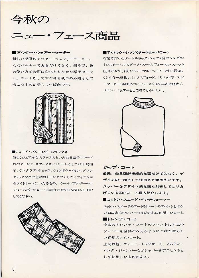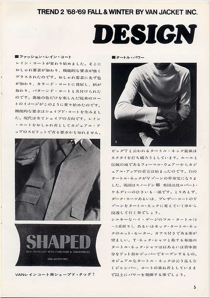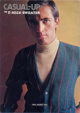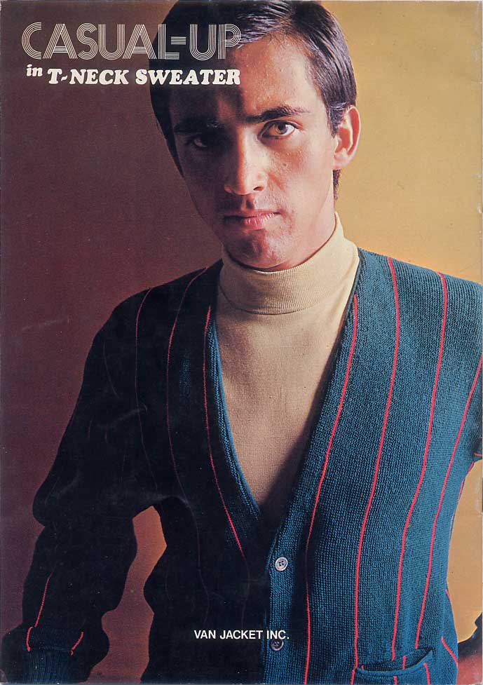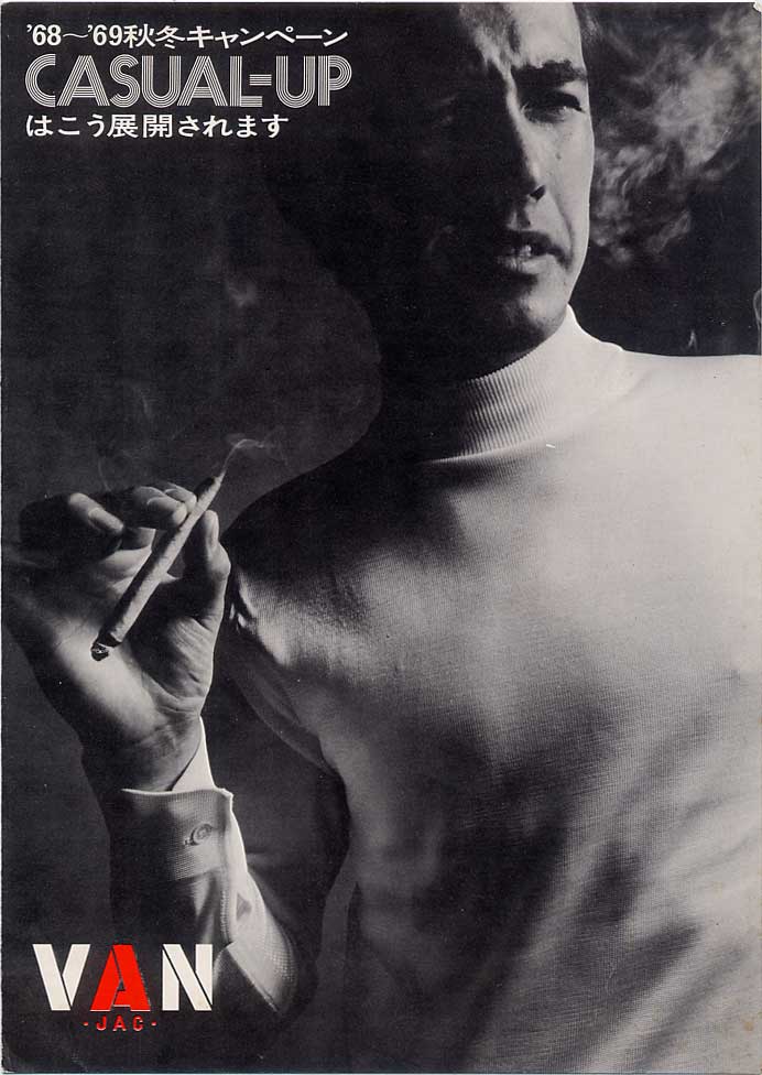 その後の1968〜69年秋冬では、基本的にカジュアル化を進める中でカジュアル・ウェアをドレスアップしてコーディネイトする“ CASUAL-UP ”キャンペーンを展開し、この時のマストアイテムの一つがタートル・ネックでした。