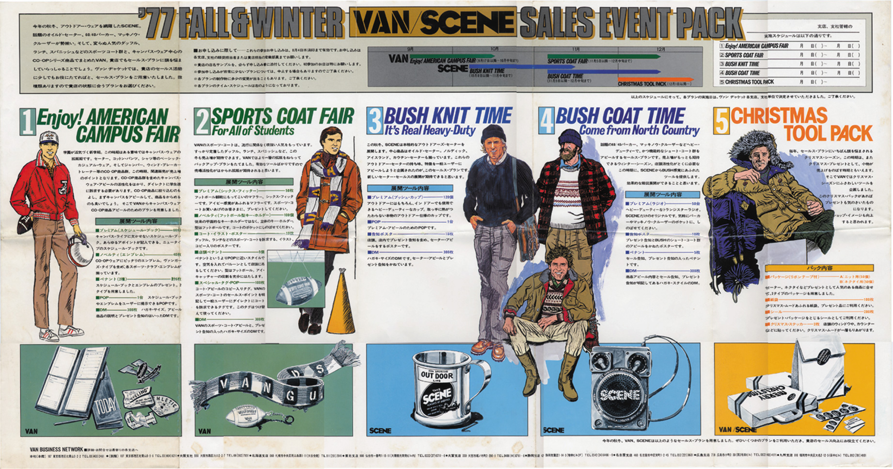 上は、“'77 FALL & WINTER VAN SCENE SALES EVENT”用のイベント・パックを告知したW=725×380mmのお得意先に配布するパンフレットで、各月にあわせたタイムスケジュールで実施される販売促進キャンペーンのギミックとその時に使用するノベルティーを紹介しています。