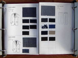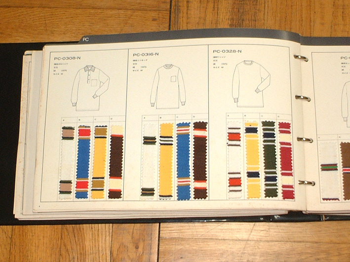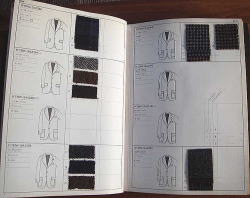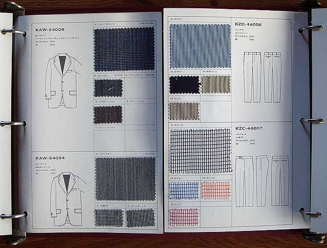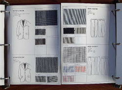 アイテム線画とスワッチ(生地見本)を整然と各ページに展開し、商談の際、お客様に判りやすいレイアウトとなっています。 |