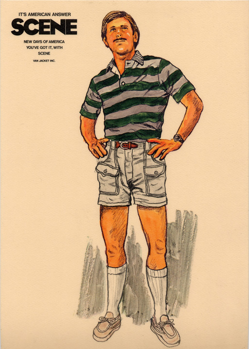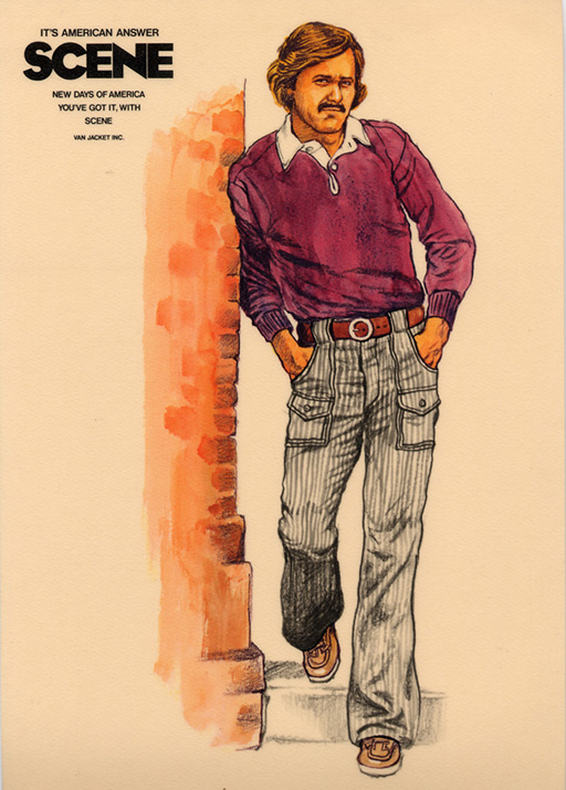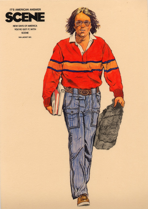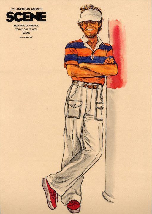 | SCENEのラガー及びカーペンターパンツの告知及びキャンペーン用に描かれたイラストレーションで、1976年製のものだと思います。SCENE CHOP立ち上がり期のものです。SCENEノベルティーで左下のラガー・ボーダー柄を、カラーは違いますがそのままスケートボードに取り入れたものが有りました。 |