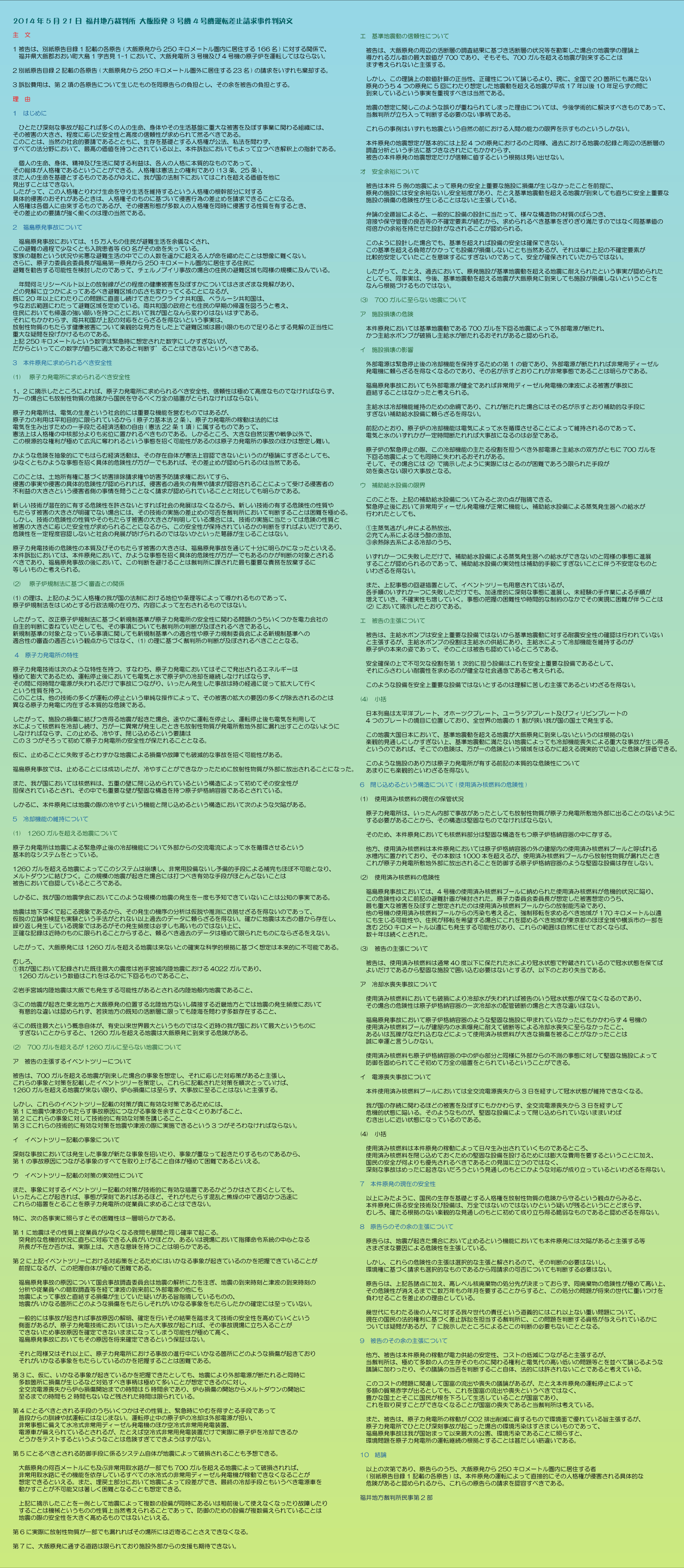 2014年5月21日、福井地裁において、大飯原発差止訴訟に対する判決が下されました。