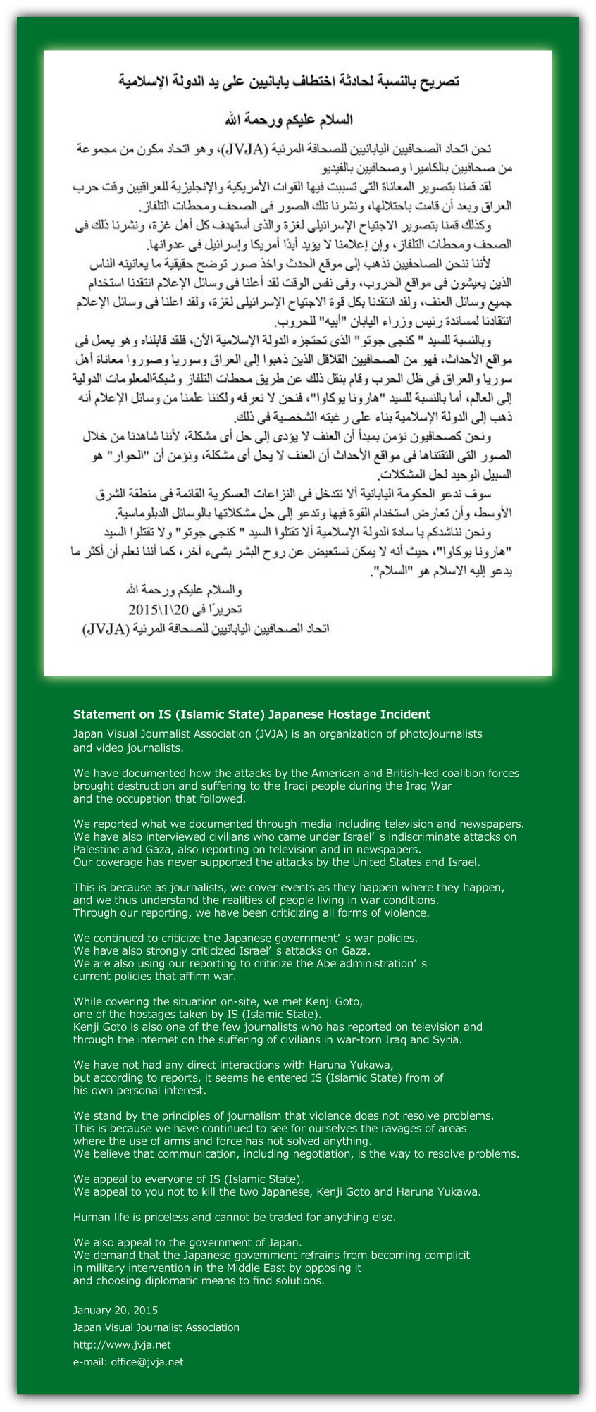 次のようなステートメントを “ 日本ビジュアル・ジャーナリスト協会 ” が拡散依頼していますので
