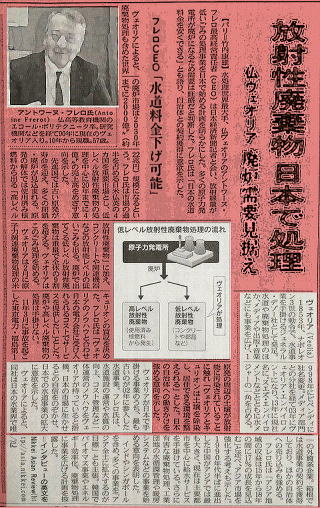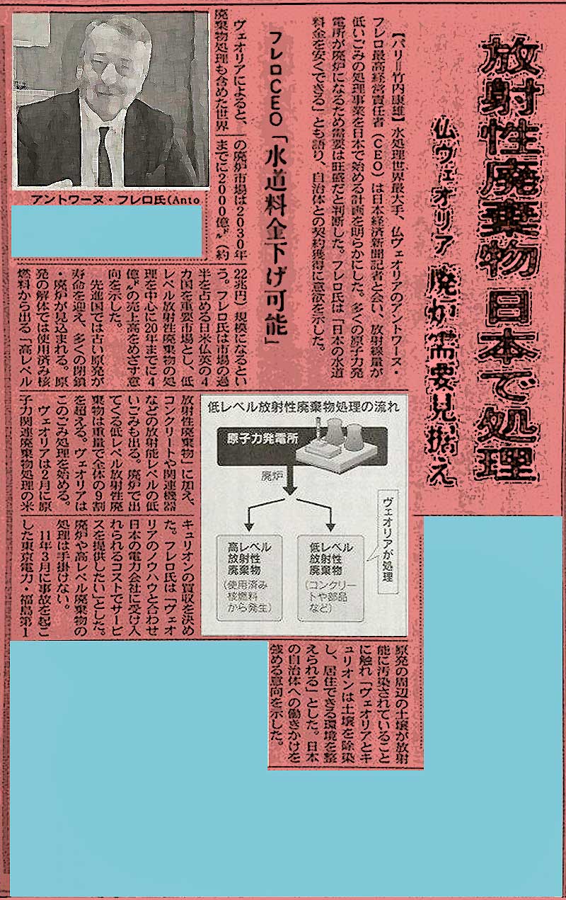 2016年4月16日日本経済新聞電子版によると、フランスのヴェオリア社が日本で、低線量放射性廃棄物処理事業を始めるという記事が掲載されています。