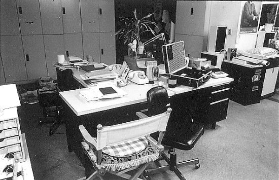 床面はグレーのカーペット敷き、各部員の机はスティール製ブラックの引き出し部にホワイト・デコラの天板を備えたもので、当時の会社用事務机(グレー一色)とは一線を画していました。