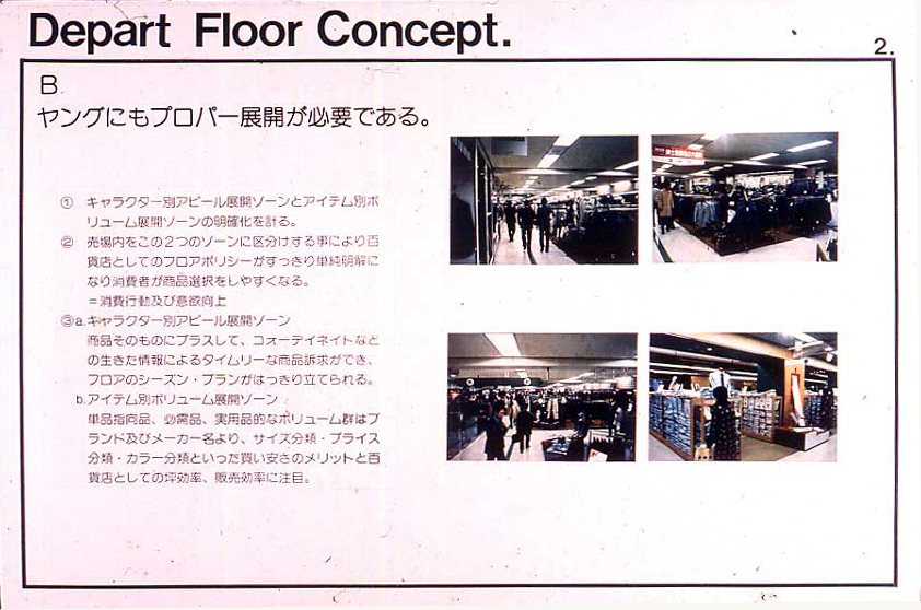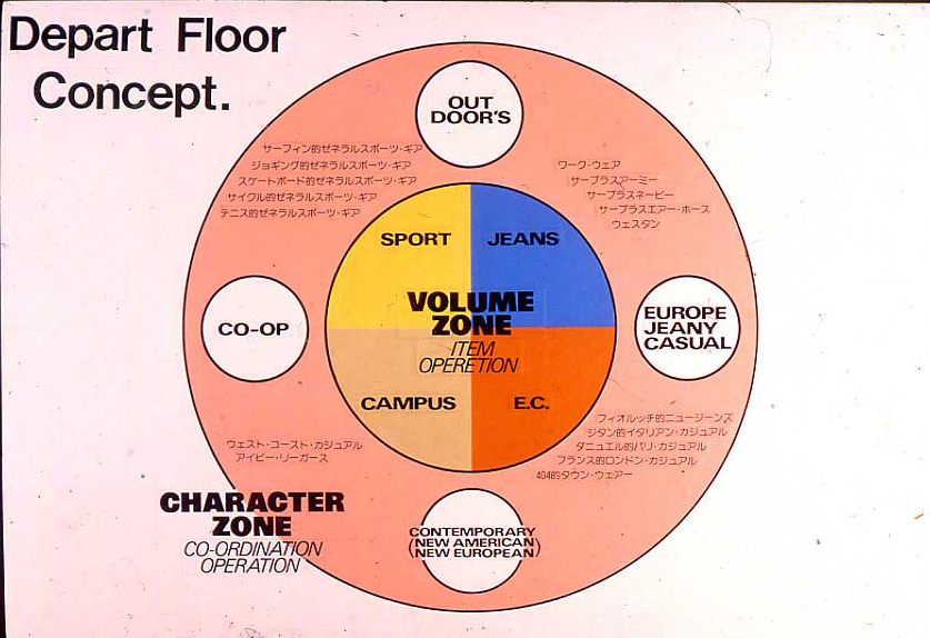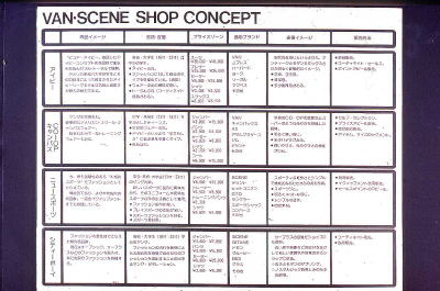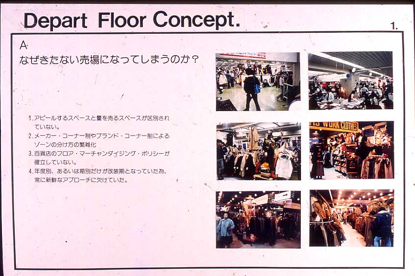 商品イメージ、客層、当て込む商品のプライス・ゾーン、適応するブランド( 他メーカーの対応するブランド名も併記しながら )、売り場のイメージ、そして販売方法まで・・・・・・・。