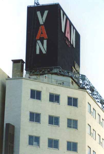 青山VAN本館の、VAN TOWN AOYAMAサイン看板を、青山3丁目交差点の対角線上歩道より見上げる。