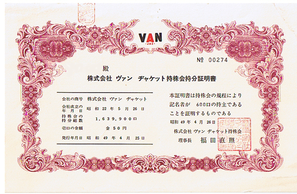 上の写真は大塚氏より送られた“VAN 名古屋支店が入っていた山村ビル(組織図の中にも名古屋支店の写真が有ります)と1974年の株式会社ヴァンヂャケット持株会”発行の持株証明書の写真です。VANは当時、1973年頃より、株式公開に向け動いていました。社内に通称“GP(Going