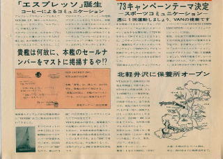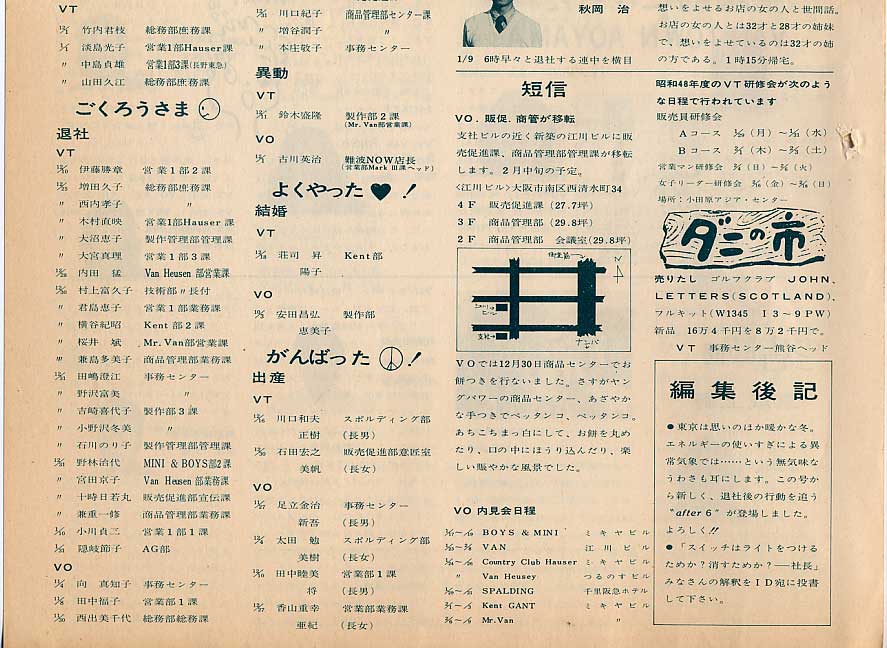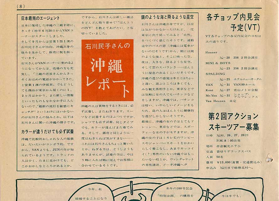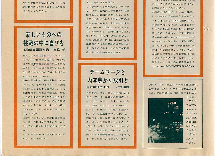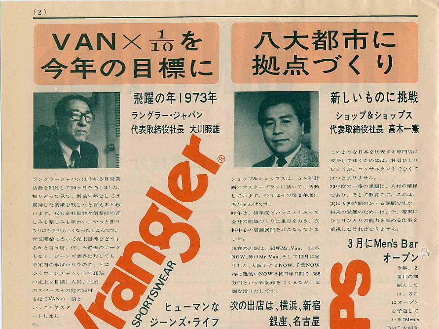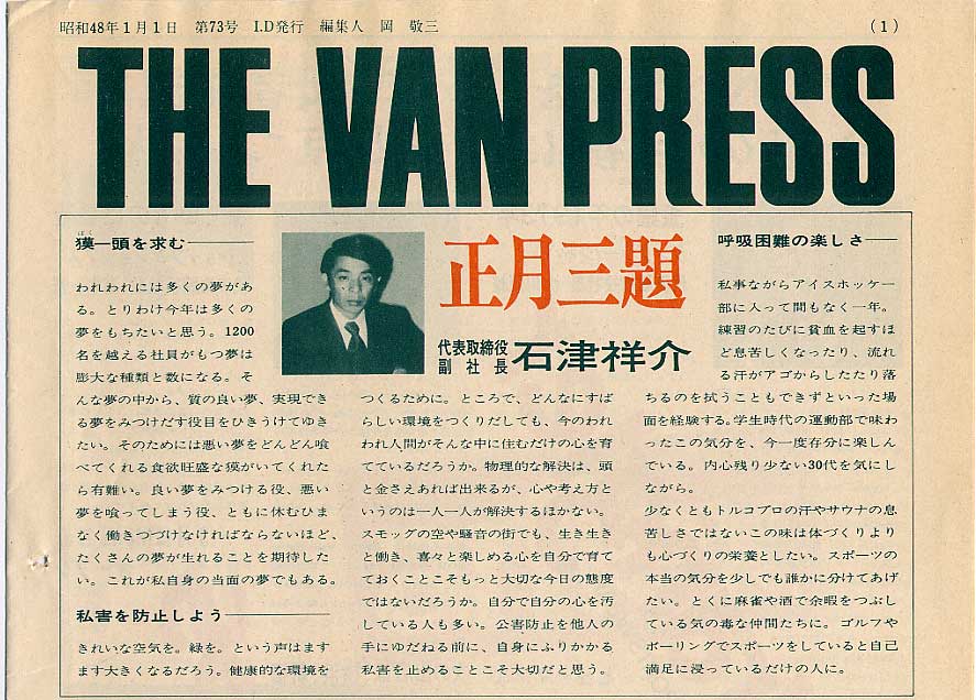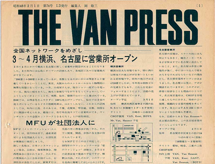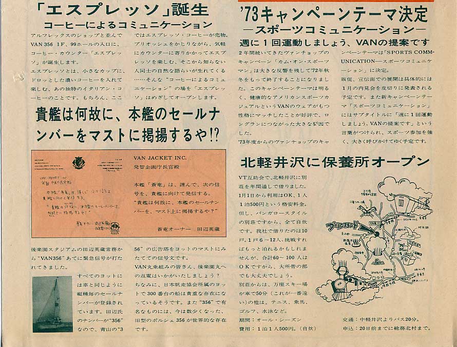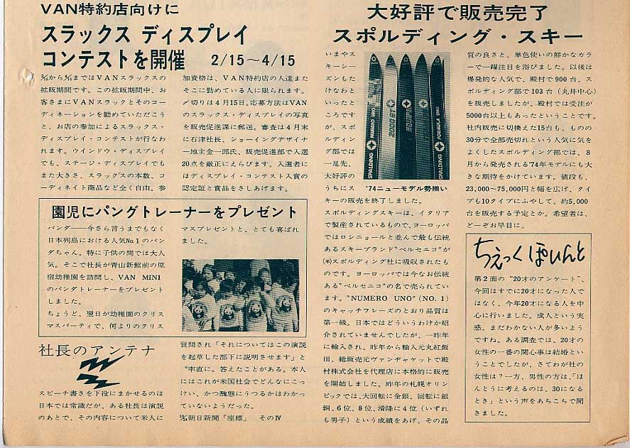 また石津謙介社長のビジネス・ウェア改造論等も中ページで大きく取り上げられ、73年に向うVAN JACKETの意気込みが感じられるVAN PRESSとなっています。