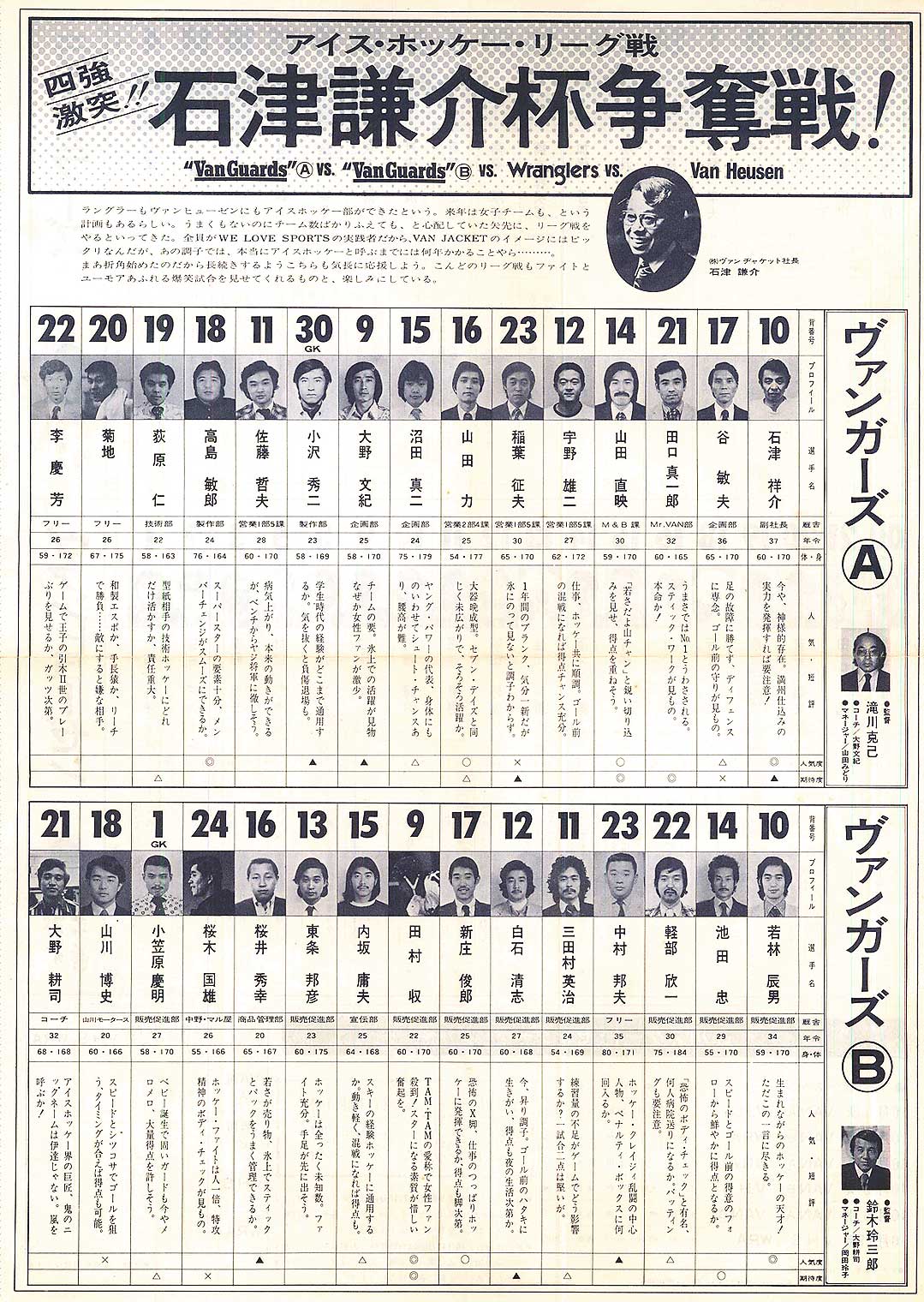 『 石津謙介杯 』争奪戦の4チーム及びそのメンバー紹介表です。