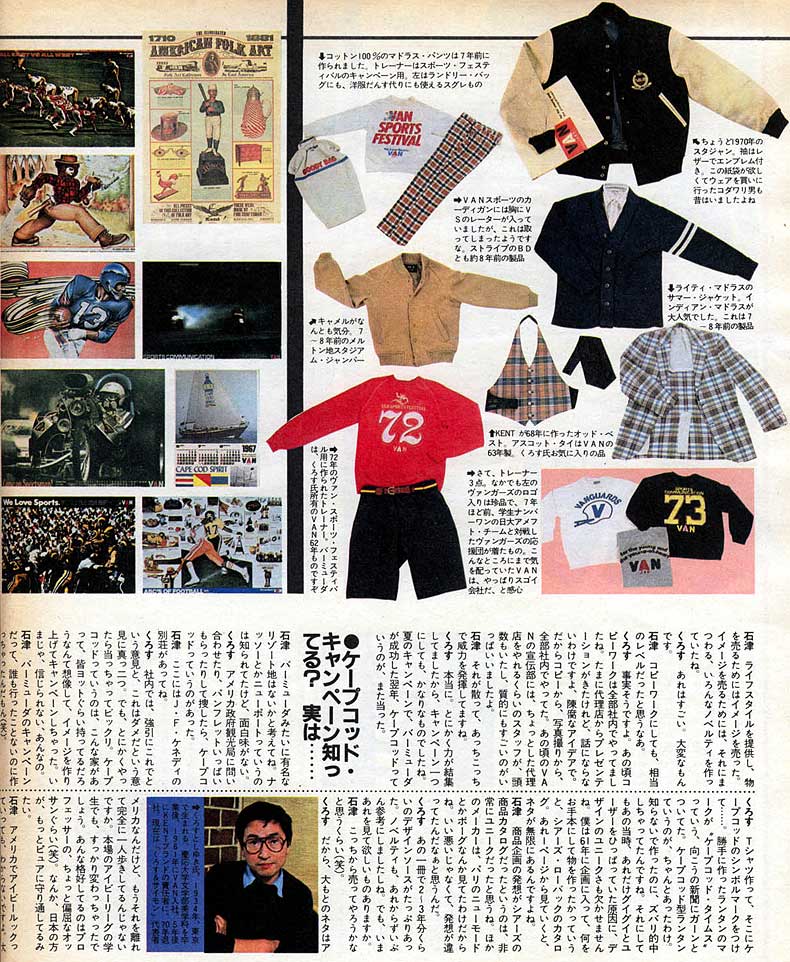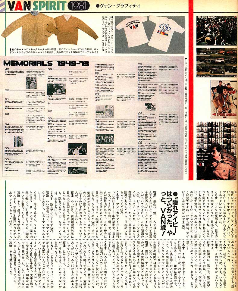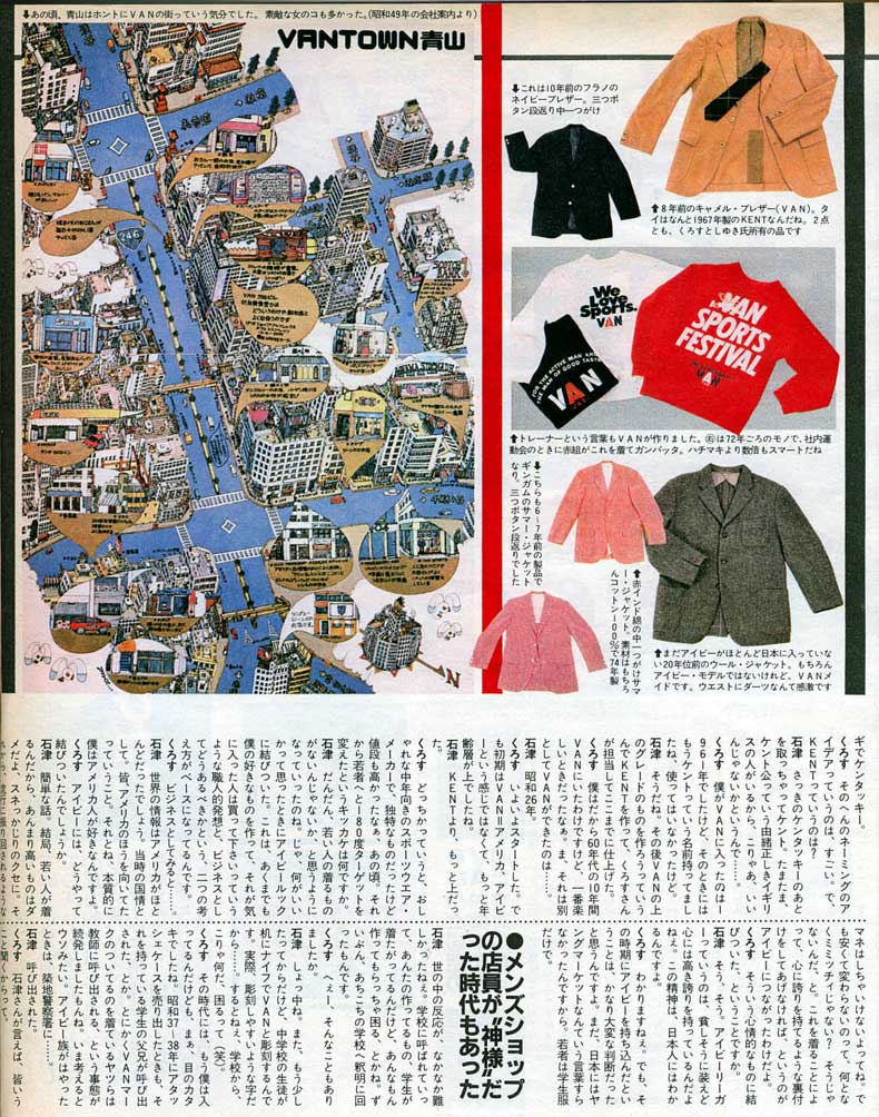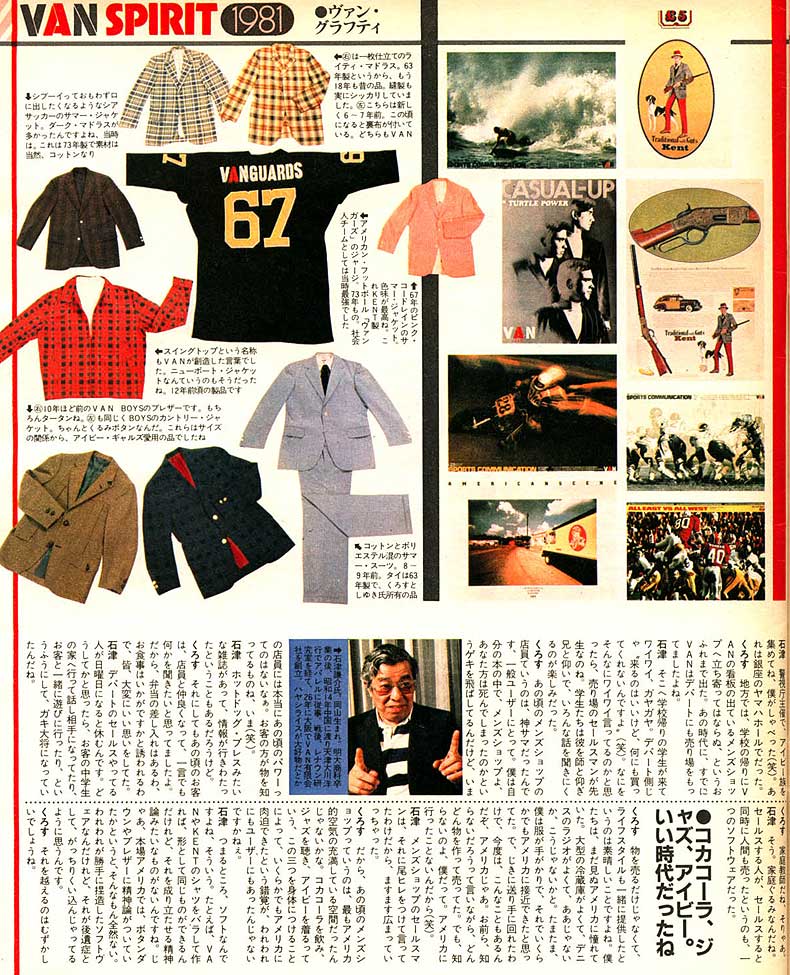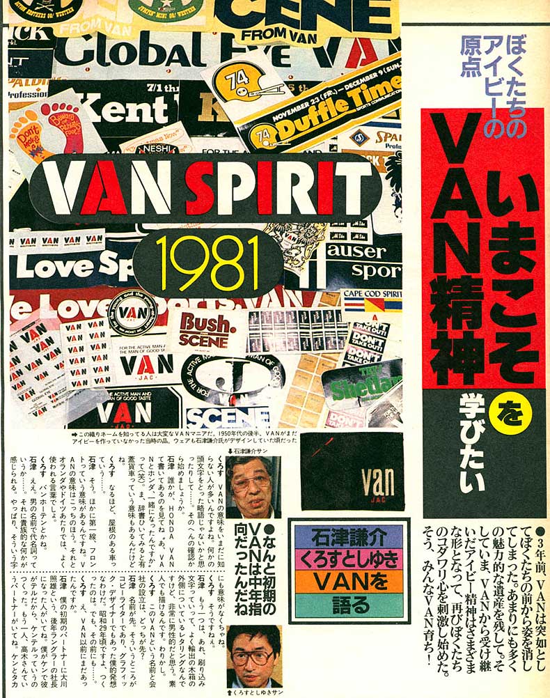 「かつてこれだけ強い力を持ったブランドがあっただろうか。VAN,Kent,SCENEを見るにつけ、こう思う。空前の負債を抱えて倒産、ついには破産宣告まで受けた企業のブランドが3年あまりの空白期間がありながらカムバックしたのである・・。」