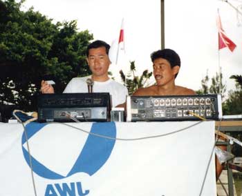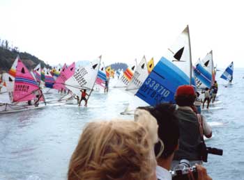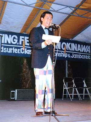 珊瑚礁のあまりにも美しい海の水平線に真っ赤な夕日が沈む頃、名護湾の白い砂浜を見下ろす防風林に囲まれた緑の芝生の会場には、特設ステージを前にして、全国各フリートからの選手500名が集合していた。