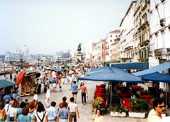 波止場から見る2本の大円柱の間に覗くドゥカーレ宮殿の美しい姿や、広場のカフェの白いテーブルとイスは、かの映画のシーンと同じだった